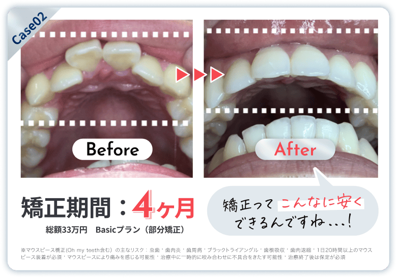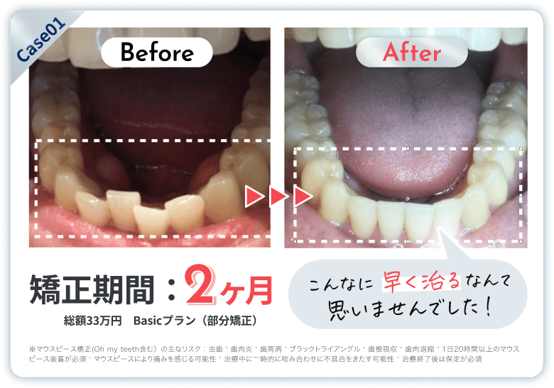 ※マウスピース橋正(Oh my teeth含む)の主なリスク:虫歯・歯周病・ブラックトライアングル・歯根吸収・歯肉退縮・1日20時間以上のマウスピース装着が必須・マウスピースにより痛みを感じる可能性・治療中に一時的にかみ合わせに不具合をきたす可能性・リテーナーを最低1年間は1日20時間以上装着、徐々に着用時間を減らし2年目以降は夜間のみの着用推奨