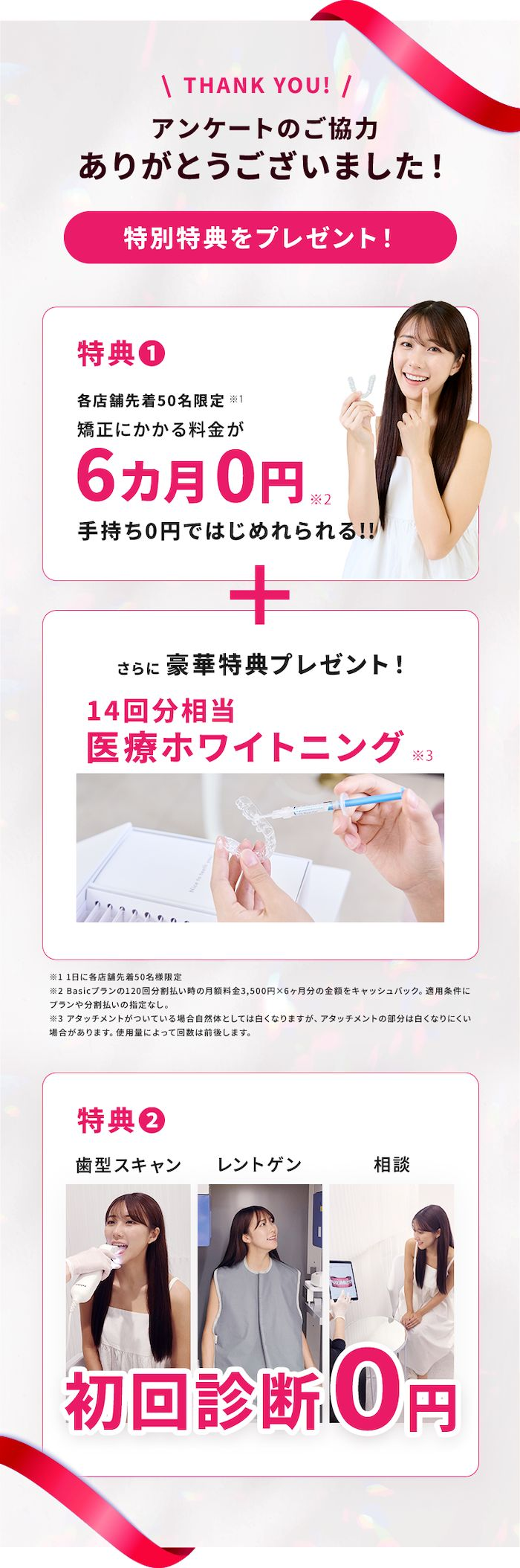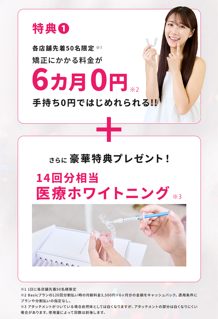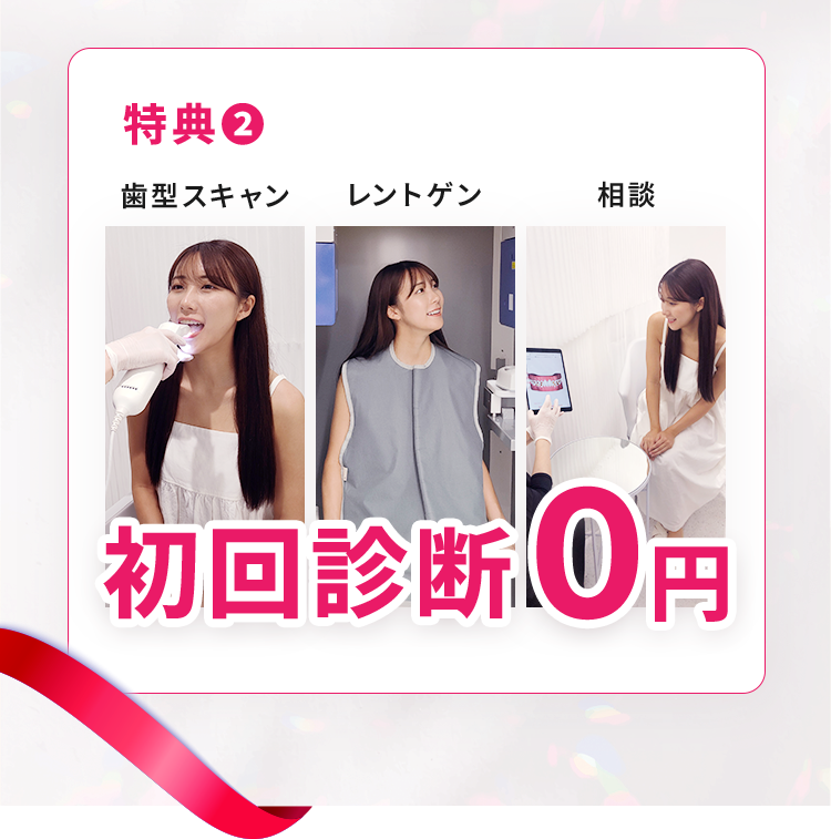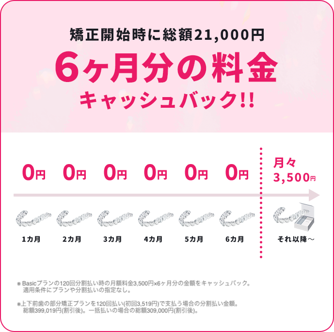※治療完了後、装着時間を守っていたのにも関わらずシミュレーション通りに歯が動かなかった場合。1回までコースをまるごとお受けいただけます。 ※装着時間の報告や治療進捗の写真報告を怠っている場合、虚偽の報告が認められる場合は対象外となります。