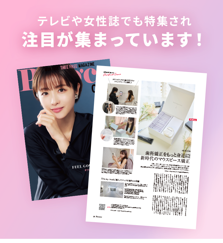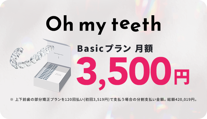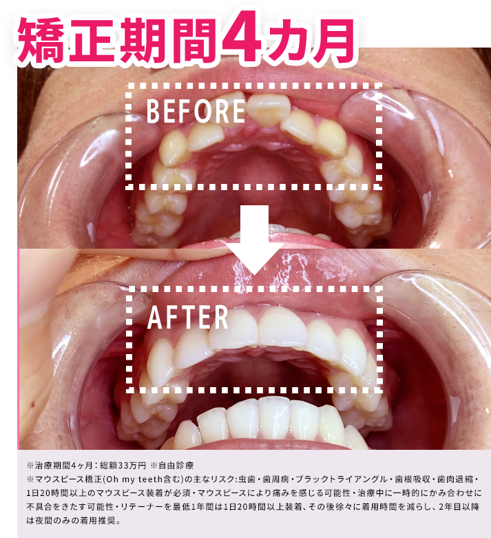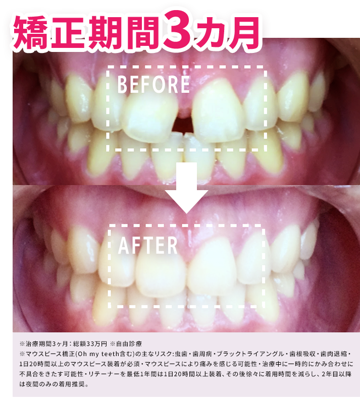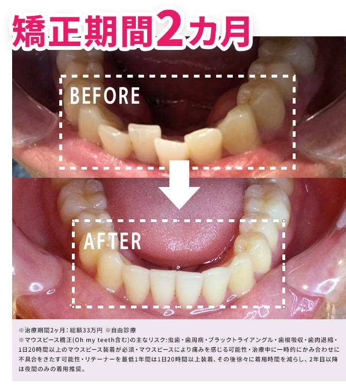 ※マウスピース橋正(Oh my teeth含む)の主なリスク:虫歯・歯周病・ブラックトライアングル・歯根吸収・歯肉退縮・1日20時間以上のマウスピース装着が必須・マウスピースにより痛みを感じる可能性・治療中に一時的にかみ合わせに不具合をきたす可能性・リテーナーを最低1年間は1日20時間以上装着、徐々に着用時間を減らし2年目以降は夜間のみの着用推奨