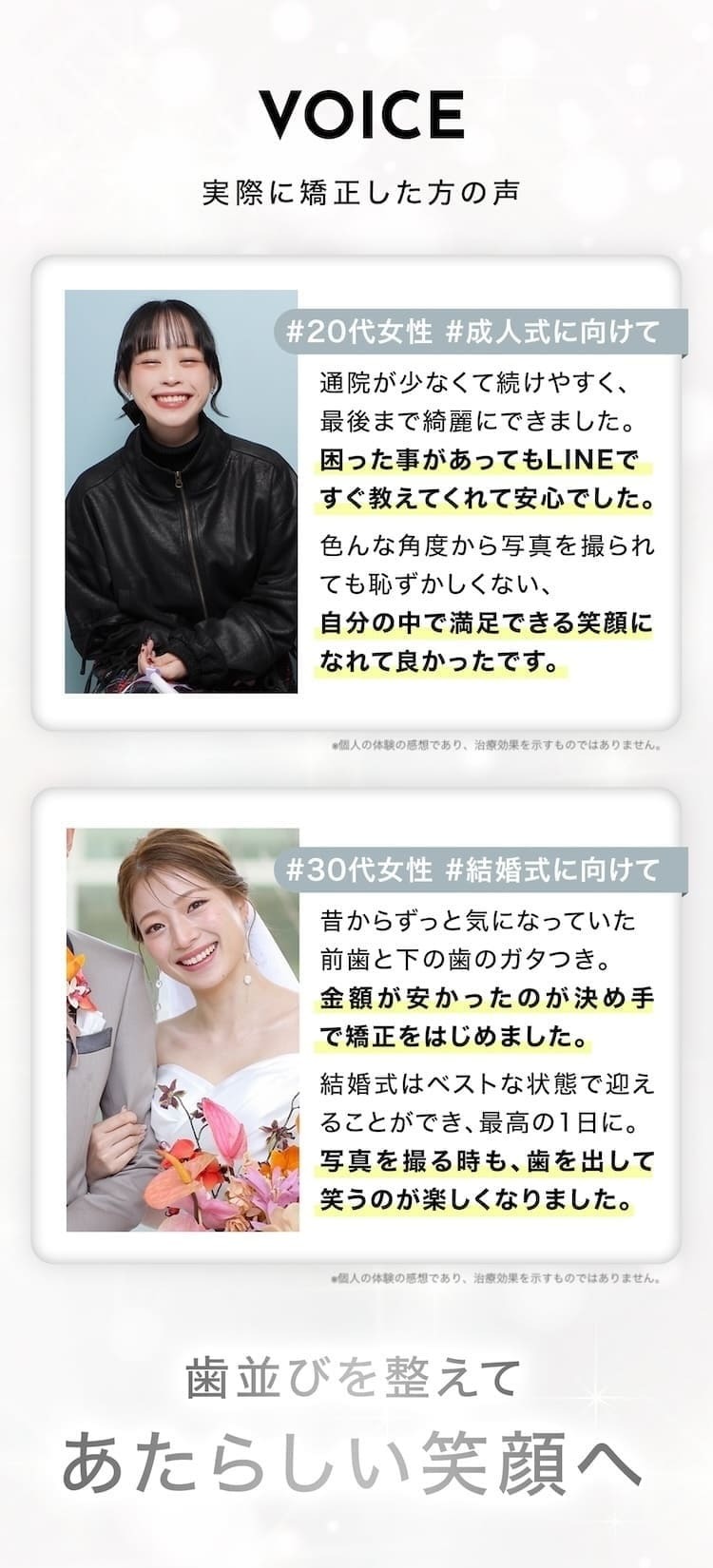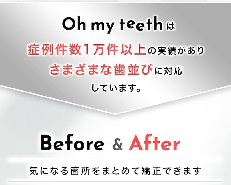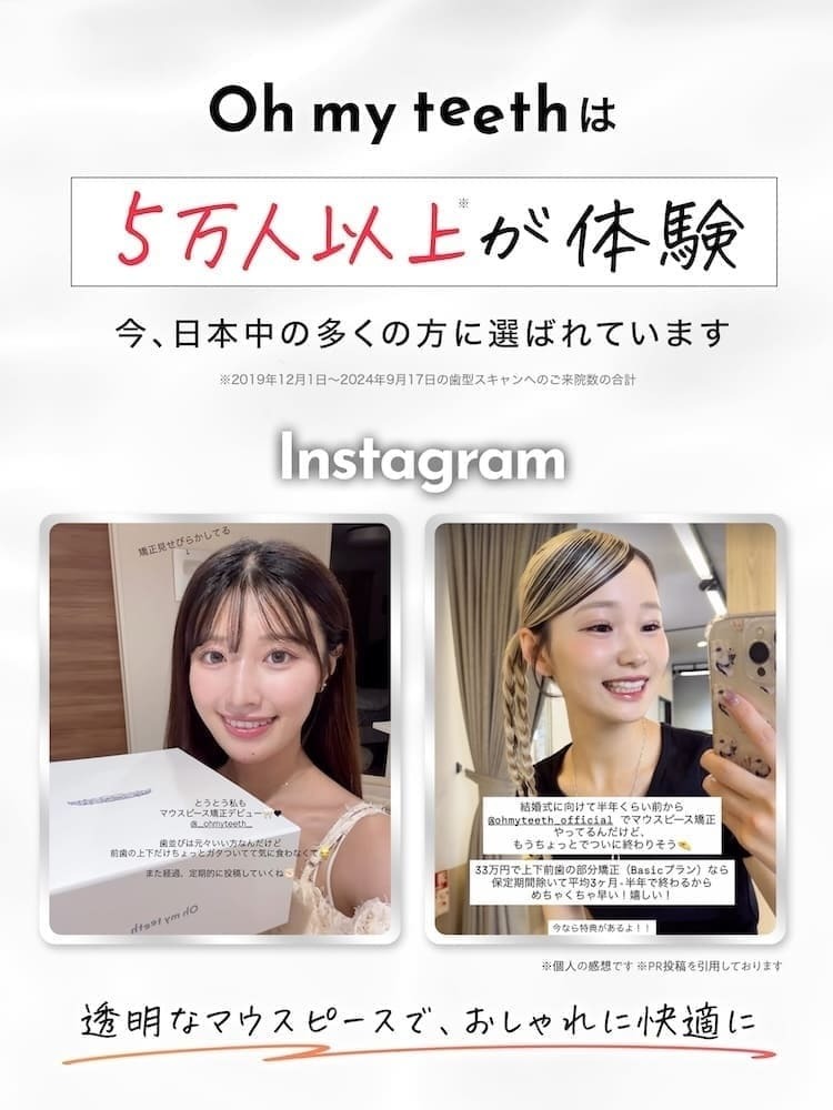 ※マウスピース橋正(Oh my teeth含む)の主なリスク:虫歯・歯周病・ブラックトライアングル・歯根吸収・歯肉退縮・1日20時間以上のマウスピース装着が必須・マウスピースにより痛みを感じる可能性・治療中に一時的にかみ合わせに不具合をきたす可能性・リテーナーを最低1年間は1日20時間以上装着、徐々に着用時間を減らし2年目以降は夜間のみの着用推奨
