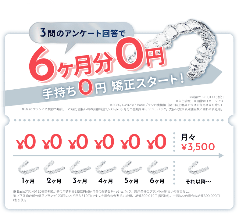 ※Basicプランの120回分割払い時の月額料金3,500円✕6ヶ月分の金額をキャッシュバック
